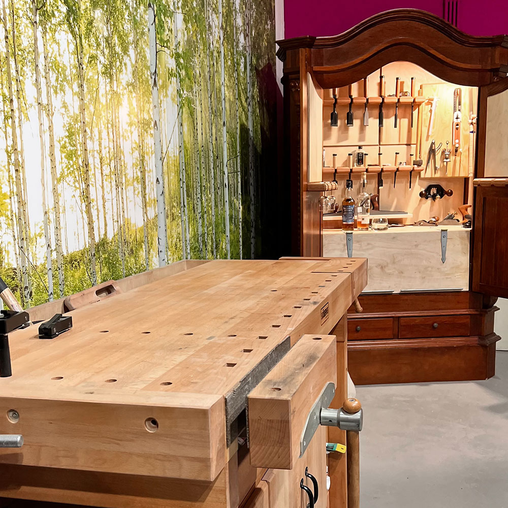 Qualitätswerkzeug, meine schwedische Hobelbank, professionelle Maschinen zur Holzbearbeitung, rückenschonendes Arbeiten mit überall gleichen Arbeitshöhen und fahrbaren Arbeitstischen, möglichst staubfreies Arbeiten mit entsprechender Absaugung, Filtermaske und Gehörschutz.