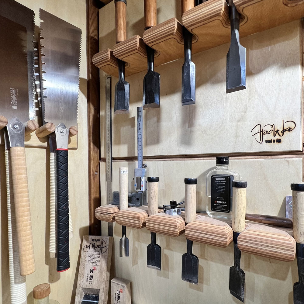 Die japanische Handwerkskunst mit handgearbeiteten Japanstemmeisen und Japansägen, die eine andere Technik im Umgang erfordern, hat mich schon lange begeistert. Der japanische Tischler hat eine besondere Beziehung zu seinem Werkzeug. Das Schärfen und die Pflege sind ein elementarer Bestandteil seiner Arbeit. Auch die Technik des „Shou Sugi Ban“ und Yakisugi, der traditionellen japanischen Konservierung von Holz, hat mich zu vielen Projekten animiert.